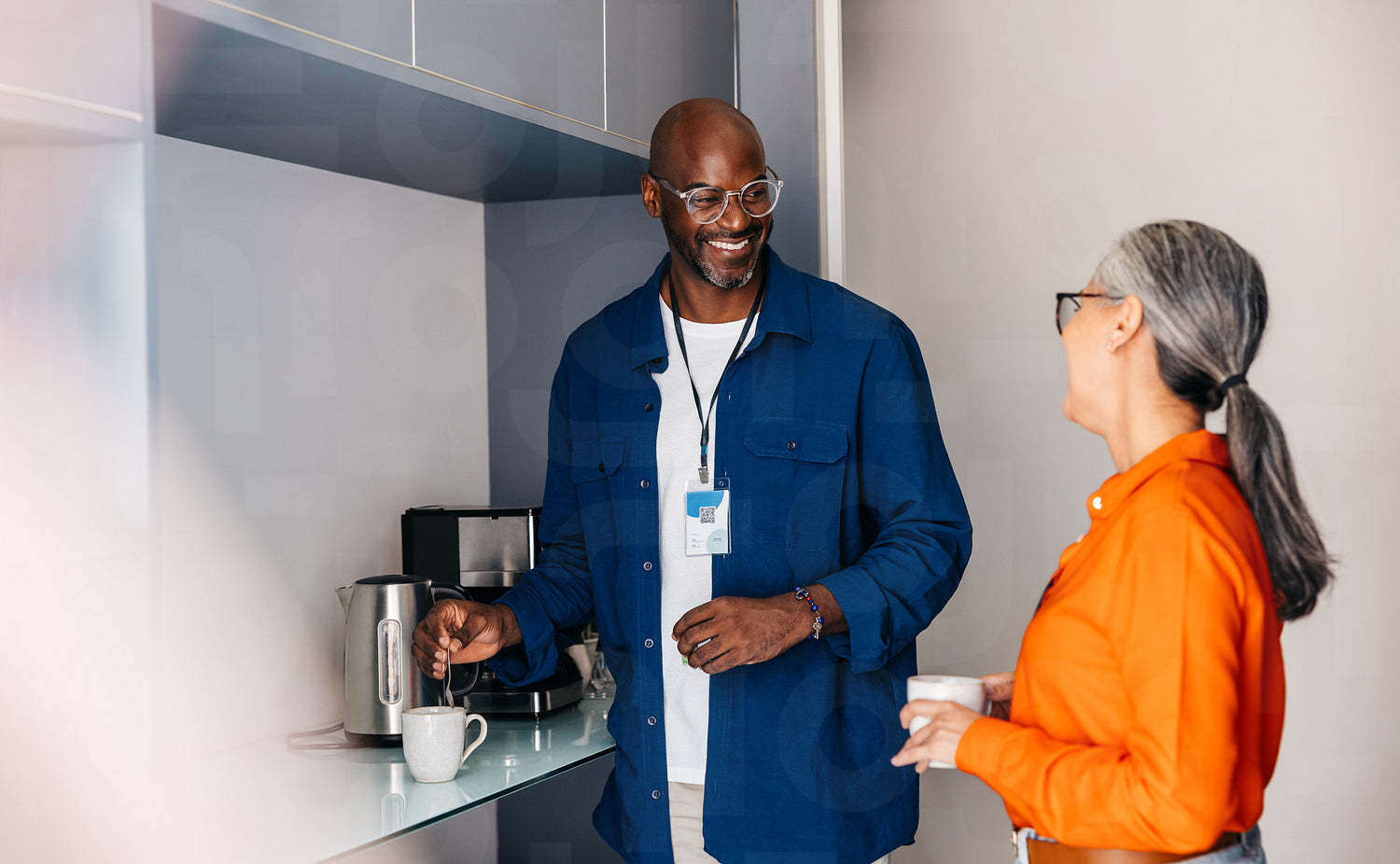 Two colleagues taking a coffee break, relaxing, having a conversation in a modern office kitchen.