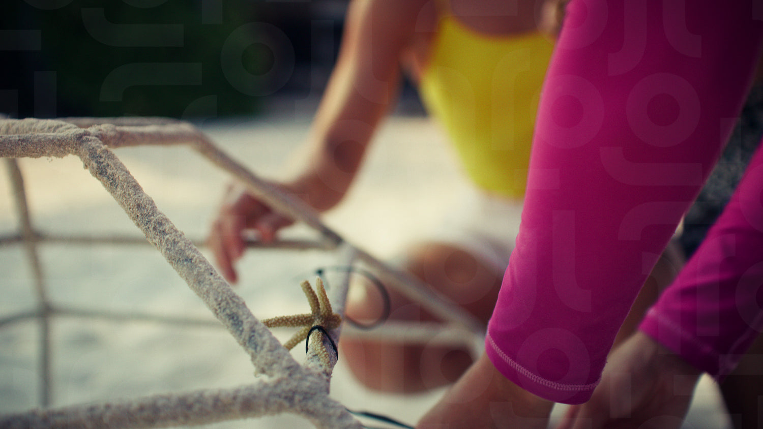 Happy family participates in a coral reef restoration project on a pristine white sand beach. They are attaching starfish to a frame, contributing to marine conservation and learning about ocean life.