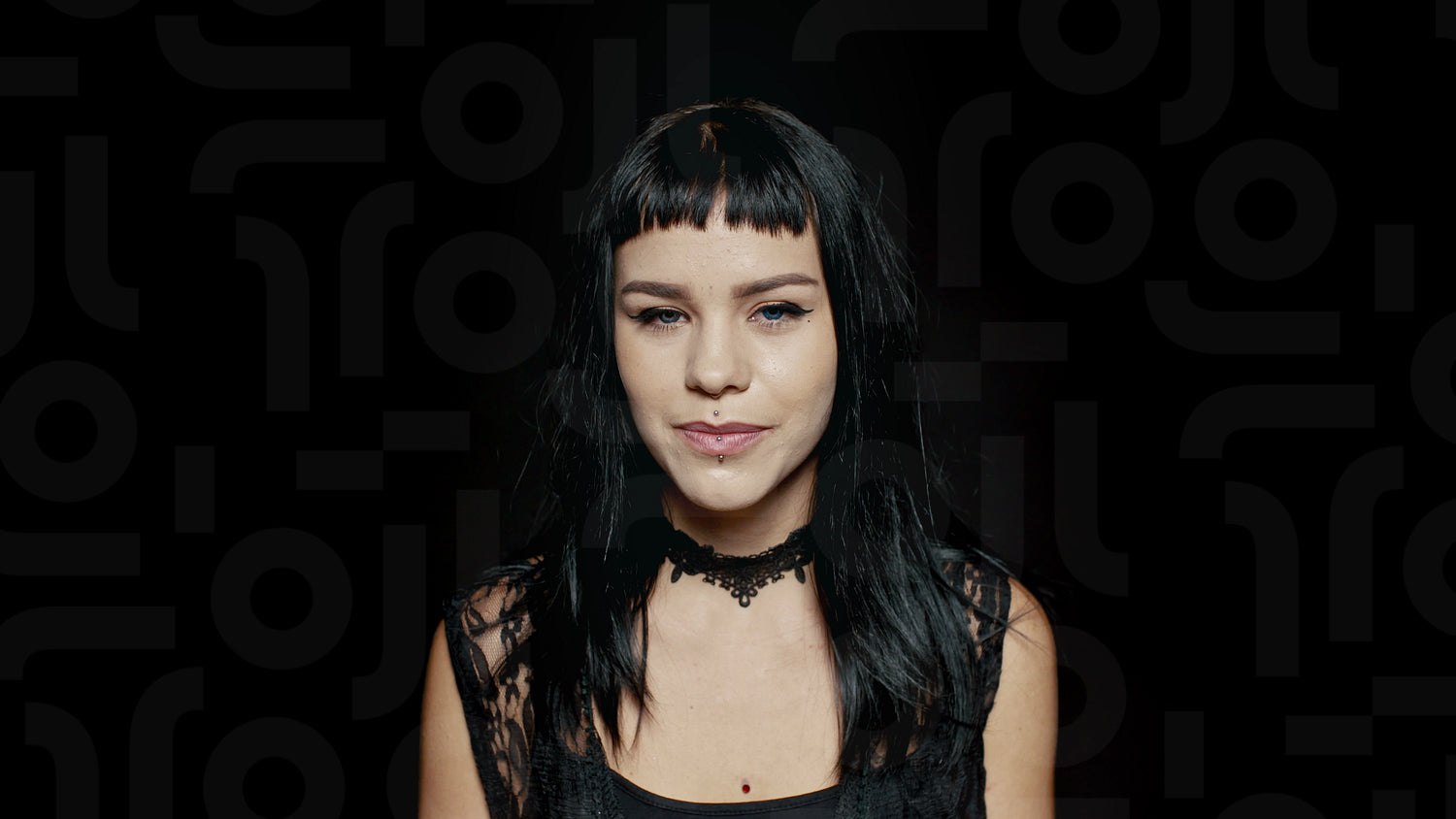 Beautiful woman with pierced lips smiling against black background. Young gothic woman looking happy.