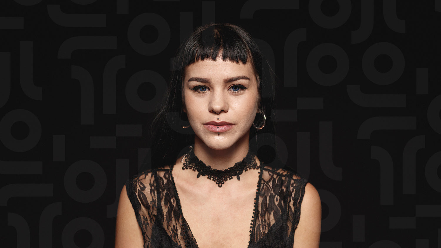 Woman with piercing on lips isolated on black background. Portrait of a young gothic woman looking at camera.