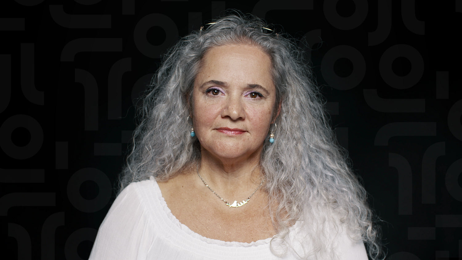 Senior woman with white hair isolated on black background. Close up of old woman looking at camera.