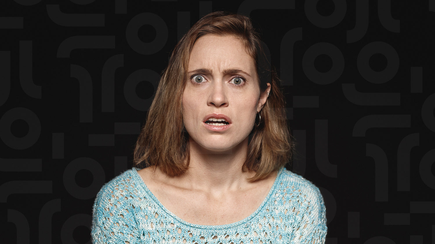 Close up of woman with short brown hair looking at camera with an expression of shock. Woman in shock and fear isolated on black background.