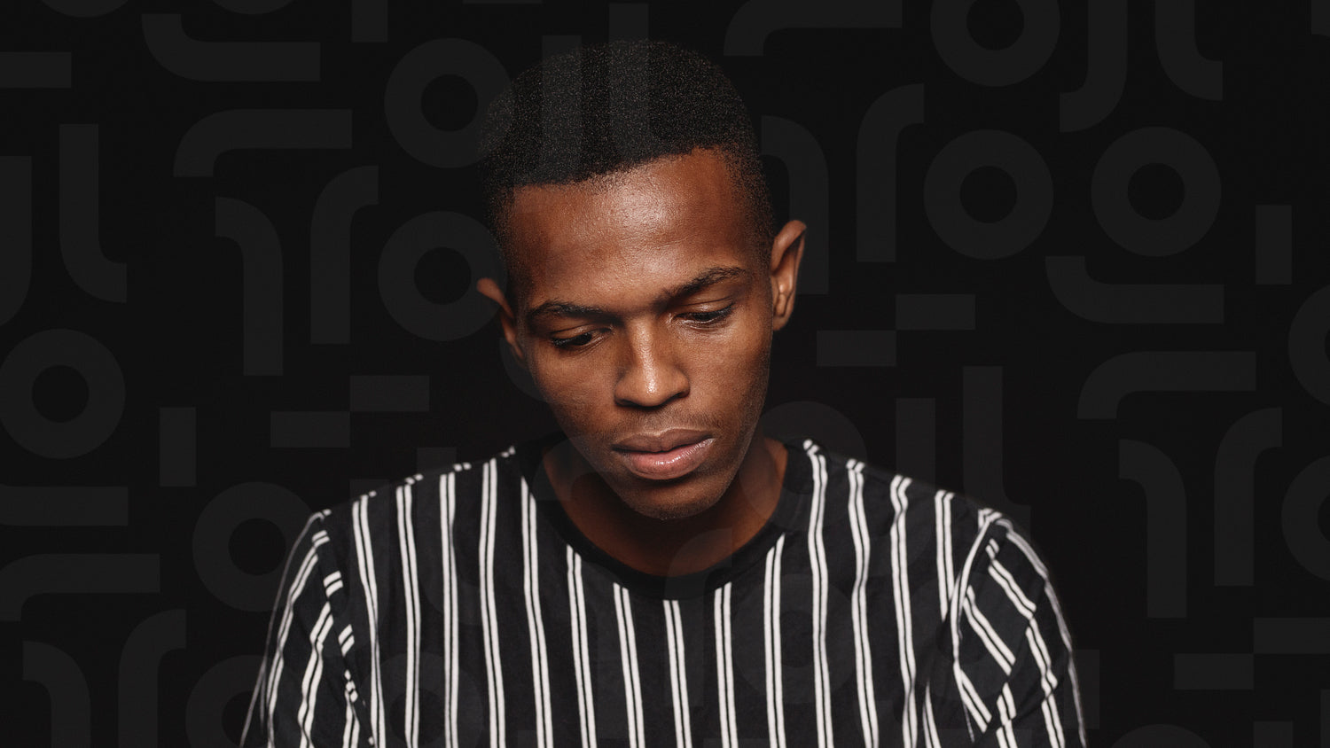 Close up of african male looking down. Portrait of sad looking african man isolated on black background.
