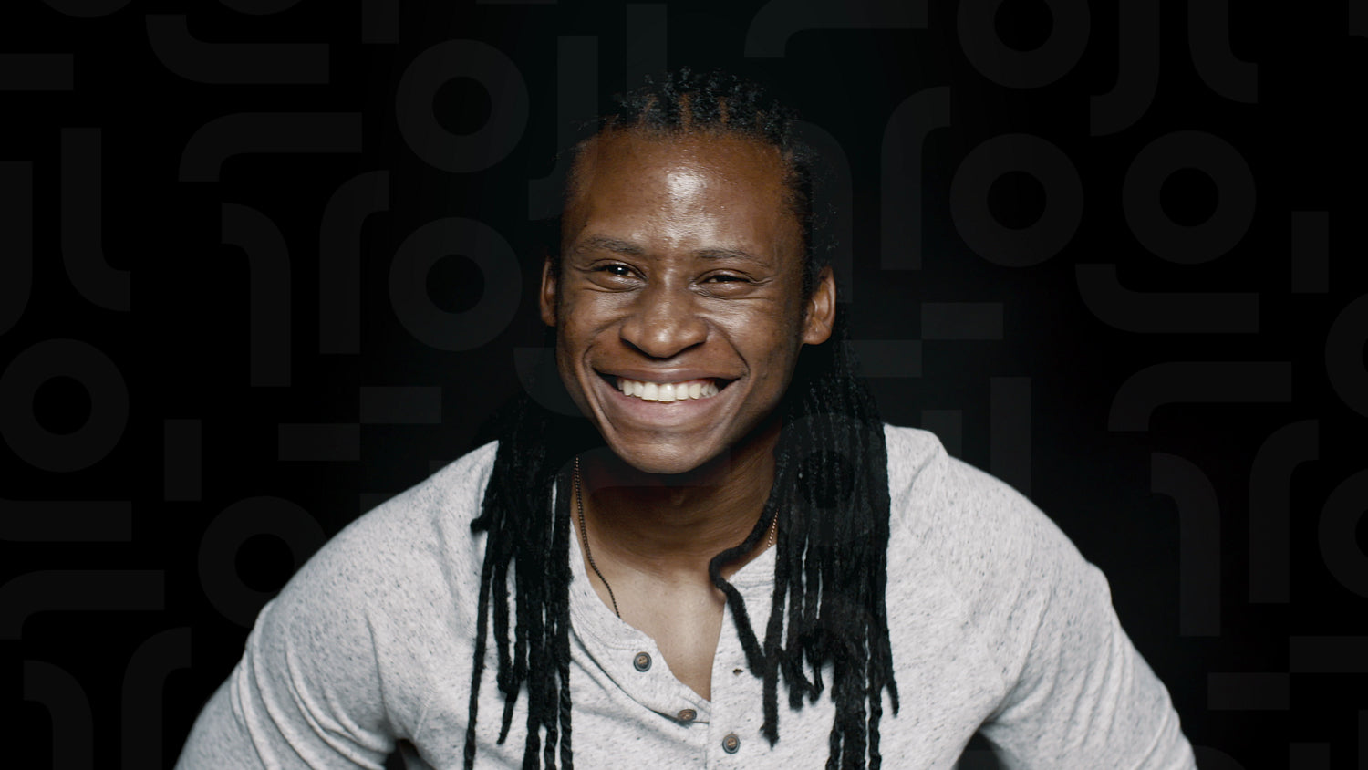 Cheerful african male with dreadlocks on black background. Close up of a laughing young man looking at camera and smiling.