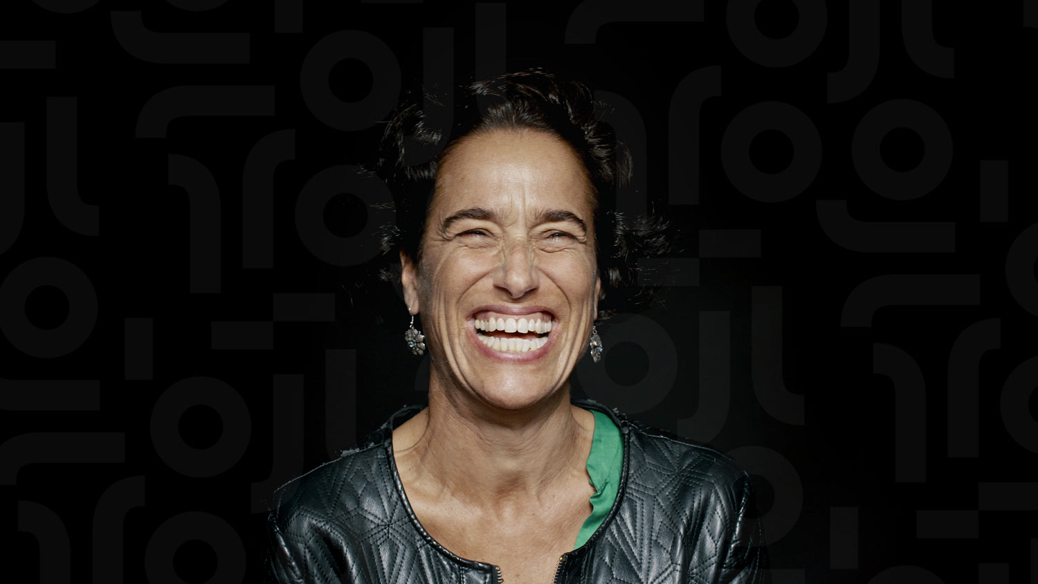 Close up of a cheerful woman with short hair isolated on black background. Happy senior woman looking at camera and laughing.