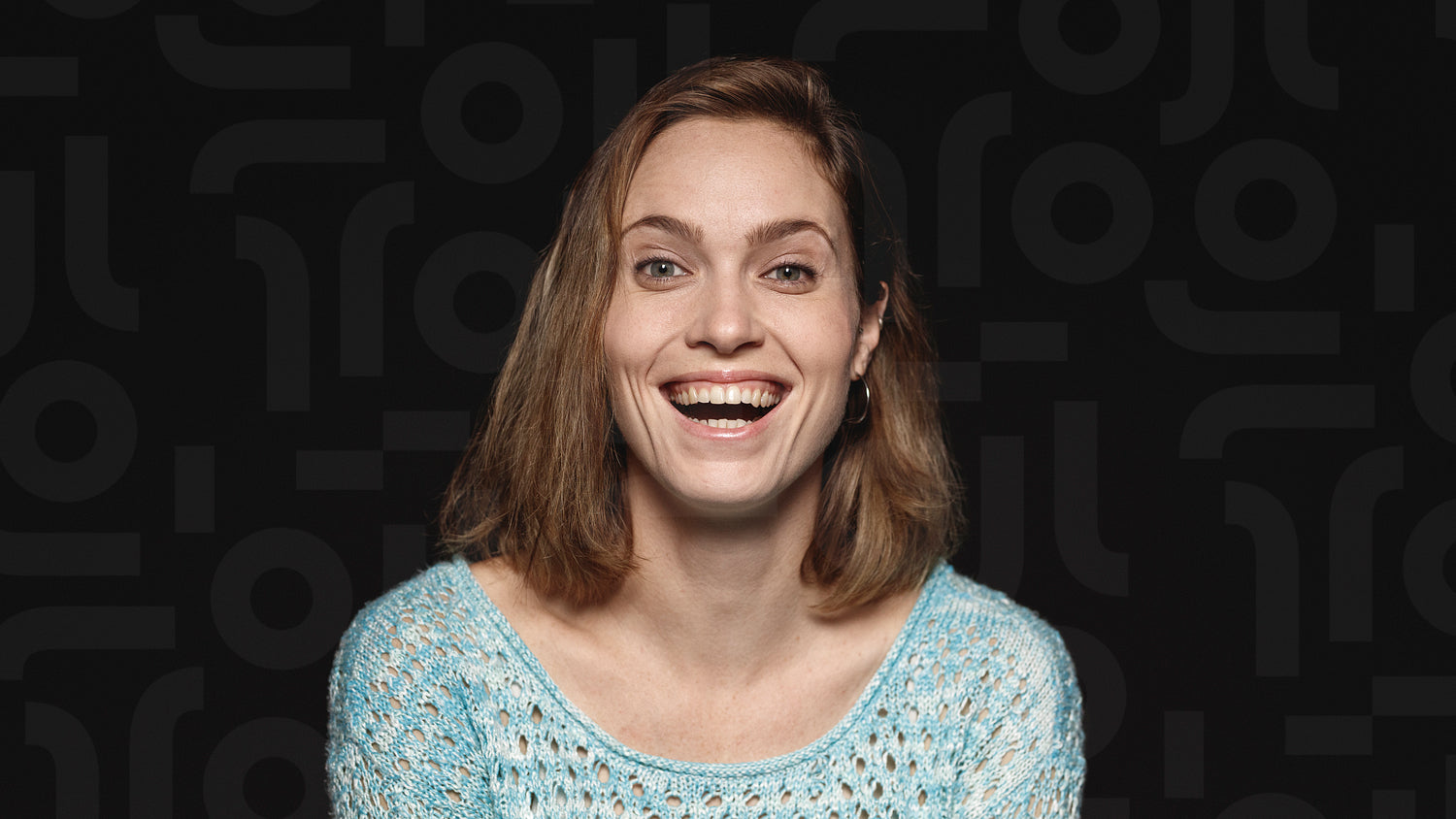 Close up of a laughing woman isolated on black background. Happy woman with short brown hair looking at camera.