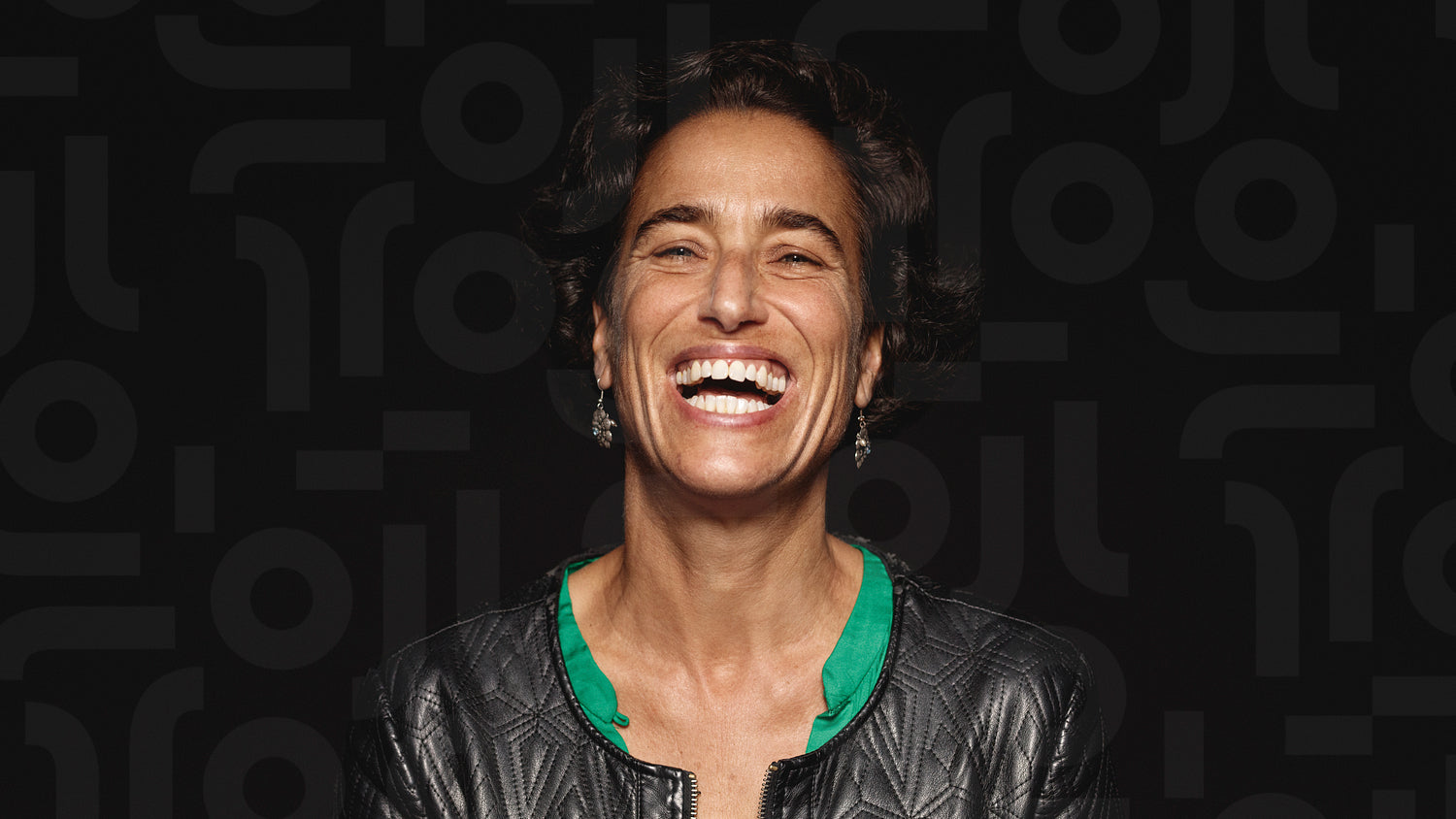 Close up of a laughing woman with short hair isolated on black background. Portrait of a happy woman looking at camera.