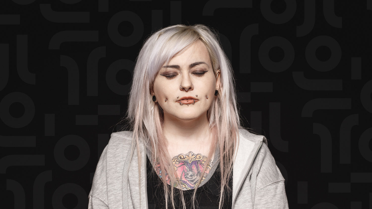 Woman with white hair and tattoo on body with her eyes closed. Woman with fashion piercing on lips and cheeks isolated on black background.