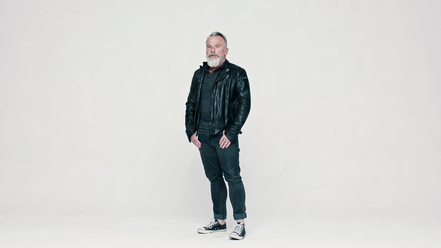 Full length of a happy senior man wearing a leather jacket on white background. Confident man with a white beard looking at camera with his hands in pocket and smiling.
