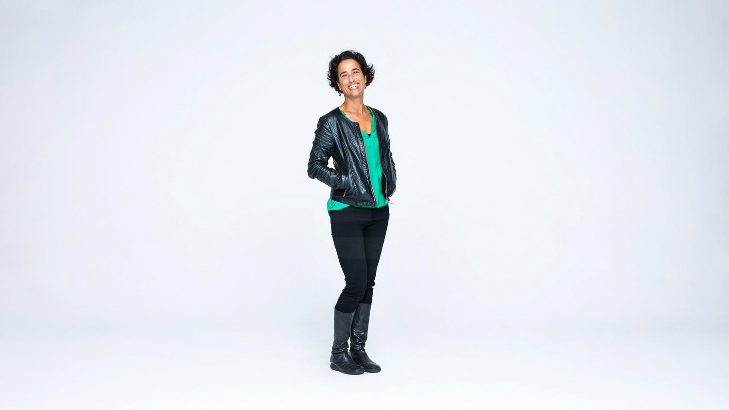 Smiling woman with short hair standing against white background looking at camera. Woman in jacket and long boots standing with hands in pockets.