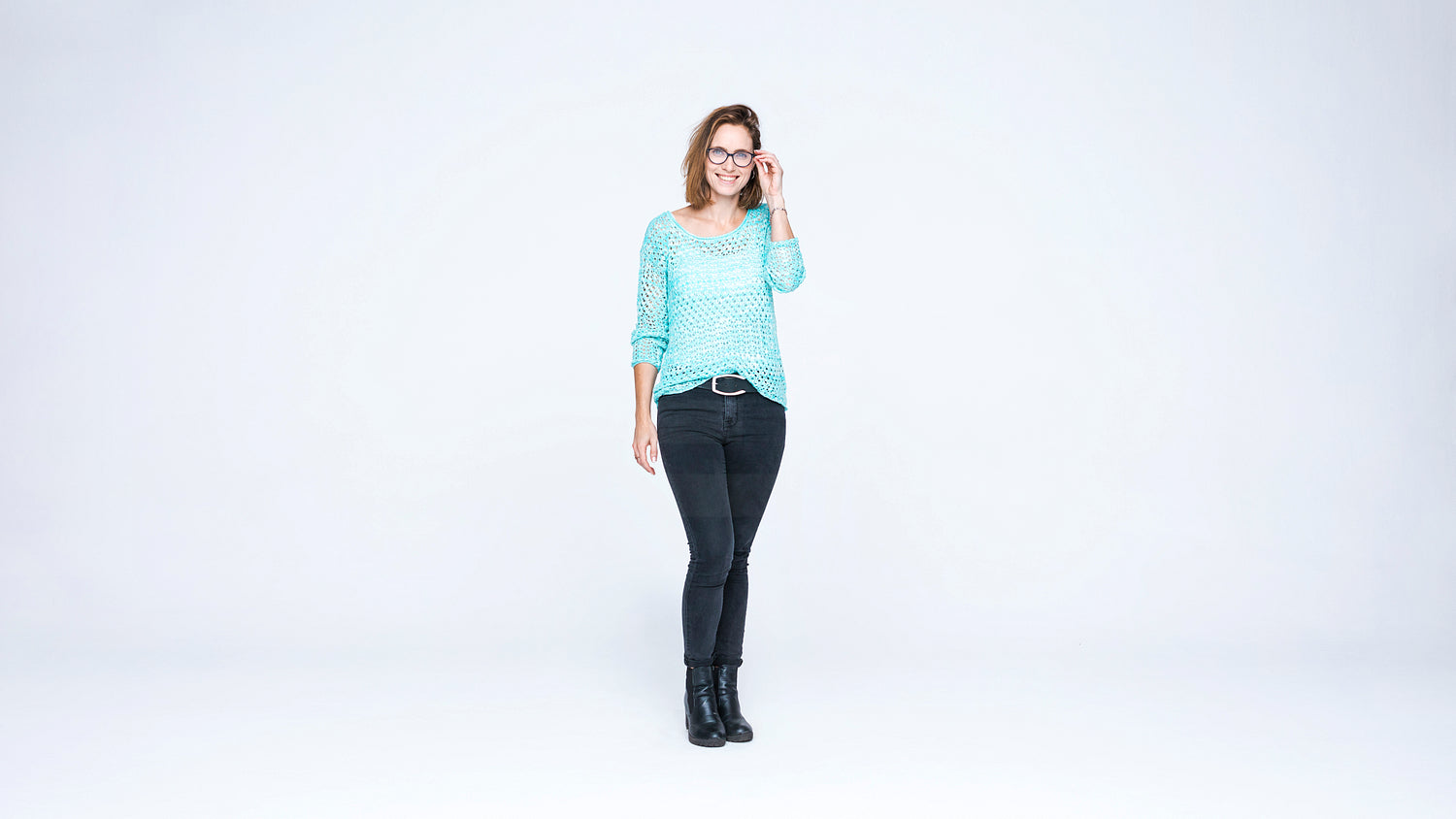 Smiling woman in eyeglasses standing against white background. Businesswoman with short brown hair looking at camera.