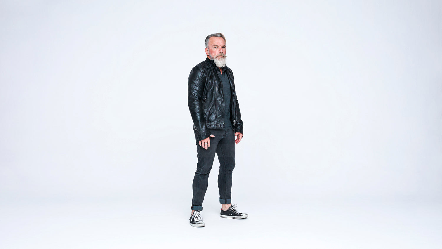 Senior man wearing a jacket isolated on white background. Man with a white beard looking at camera.