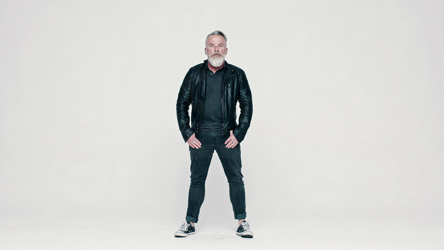 Full length of a senior man wearing a leather jacket on white background. Confident man with a white beard looking at camera with his hands in pocket.