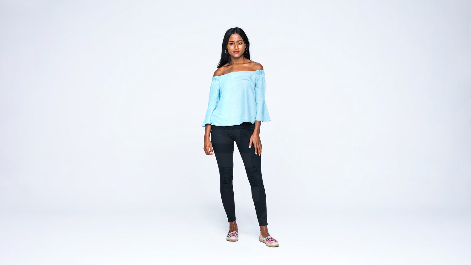Young woman looking at camera. Woman in fashionable jeans top standing isolated on white background.