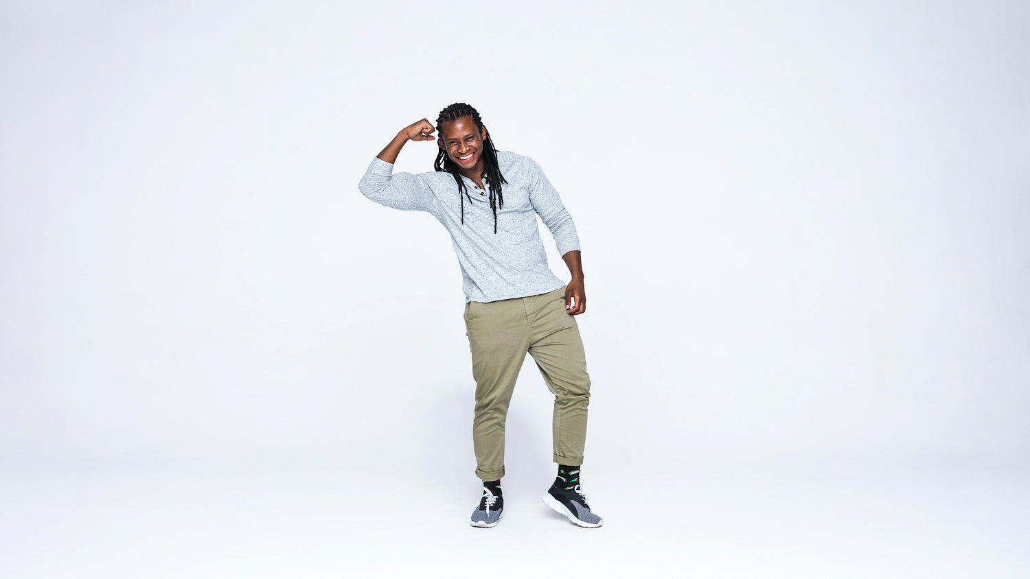 Excited african male with dreadlocks isolated on white background. Happy african man looking at camera showing his biceps.