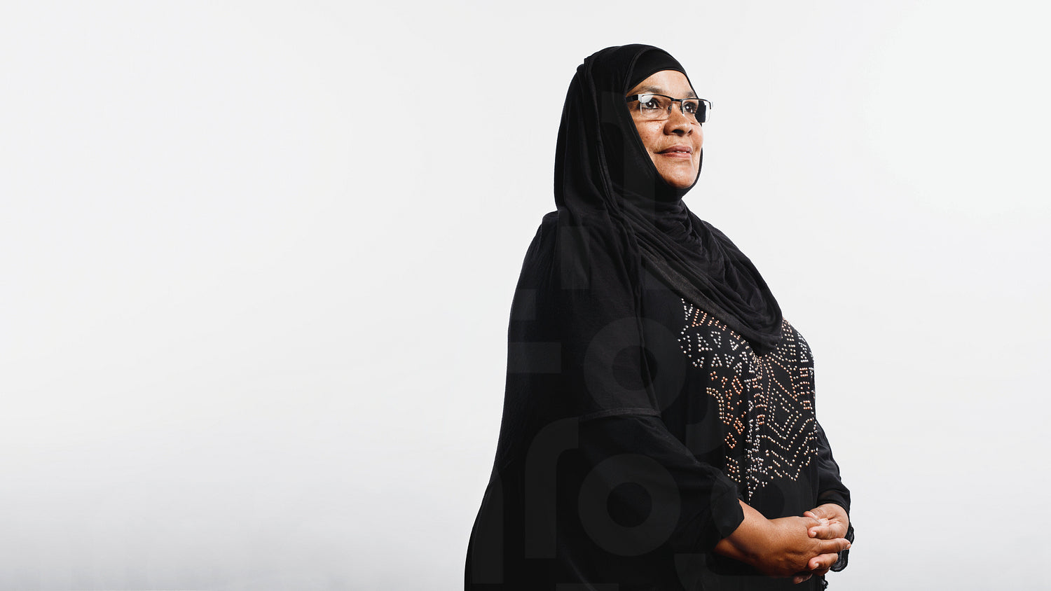 Senior muslim woman in hijab isolated on white background. Smiling arabic woman in eyeglasses and a black hijab looking away.