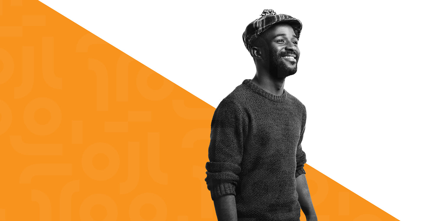 Cheerful man isolated on white background wearing a cap. Side view of african american man in winter woollen clothes.