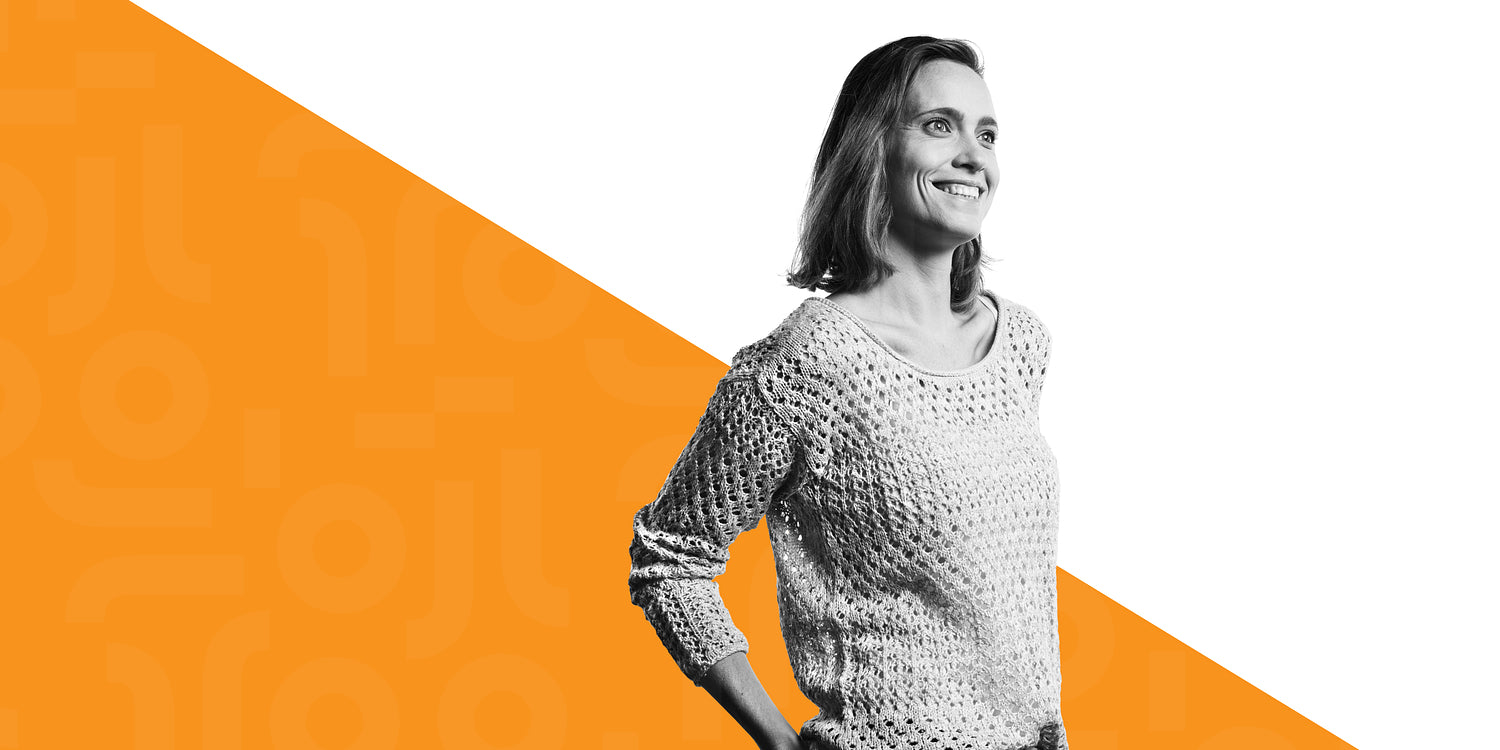 Happy woman wearing a woollen top standing against dual tone background. Smiling woman with short brown hair looking away.