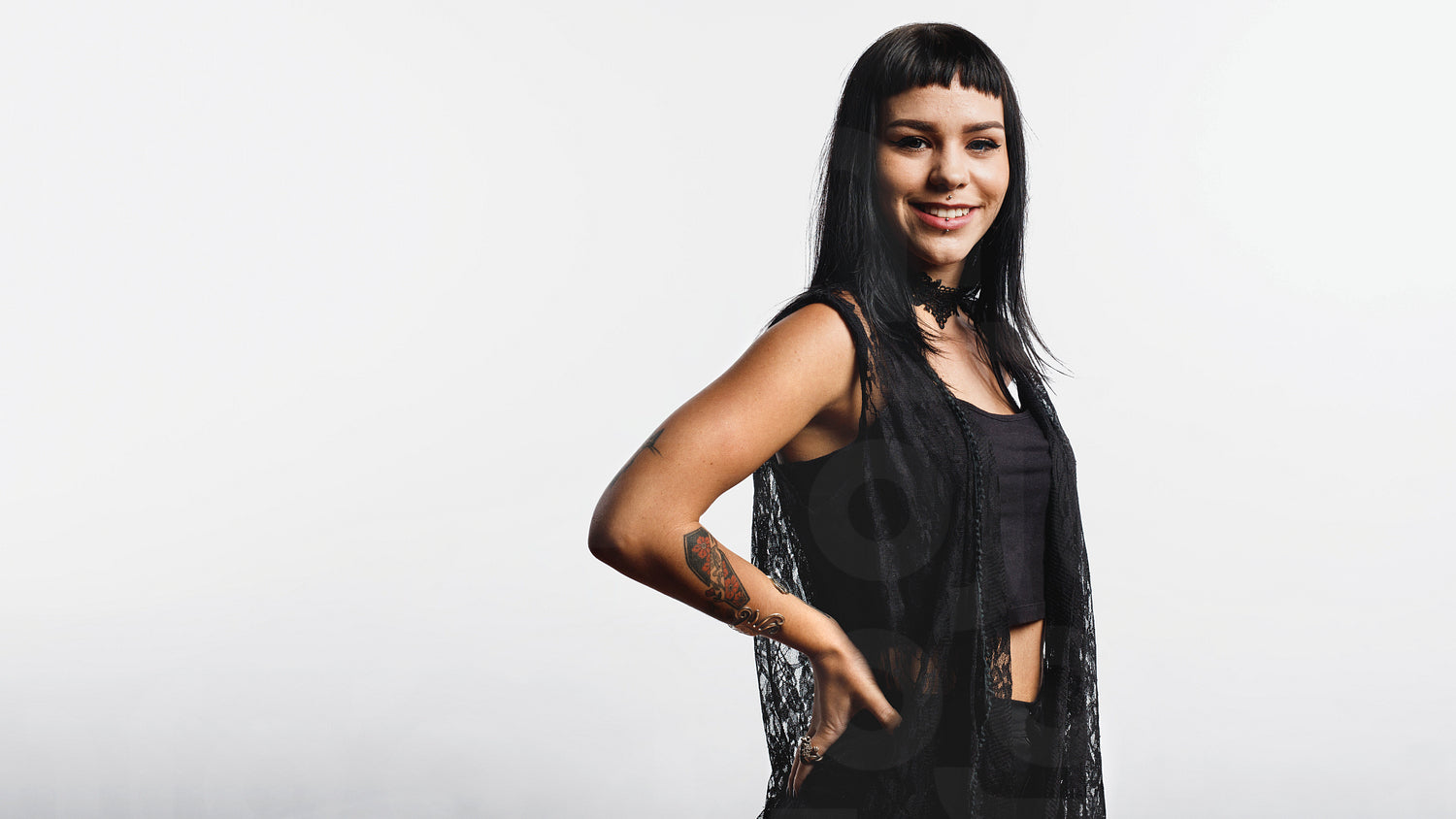 Gothic woman with fashion piercing on lips isolated on white background. Portrait of smiling young woman with tattoo on hand looking at camera.