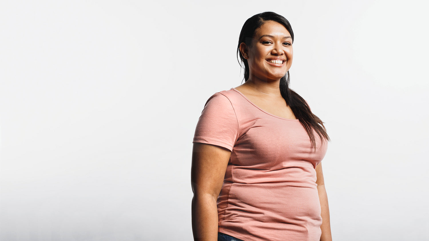 Smiling woman in tshirt standing against white background. Portrait of smiling woman looking at camera.