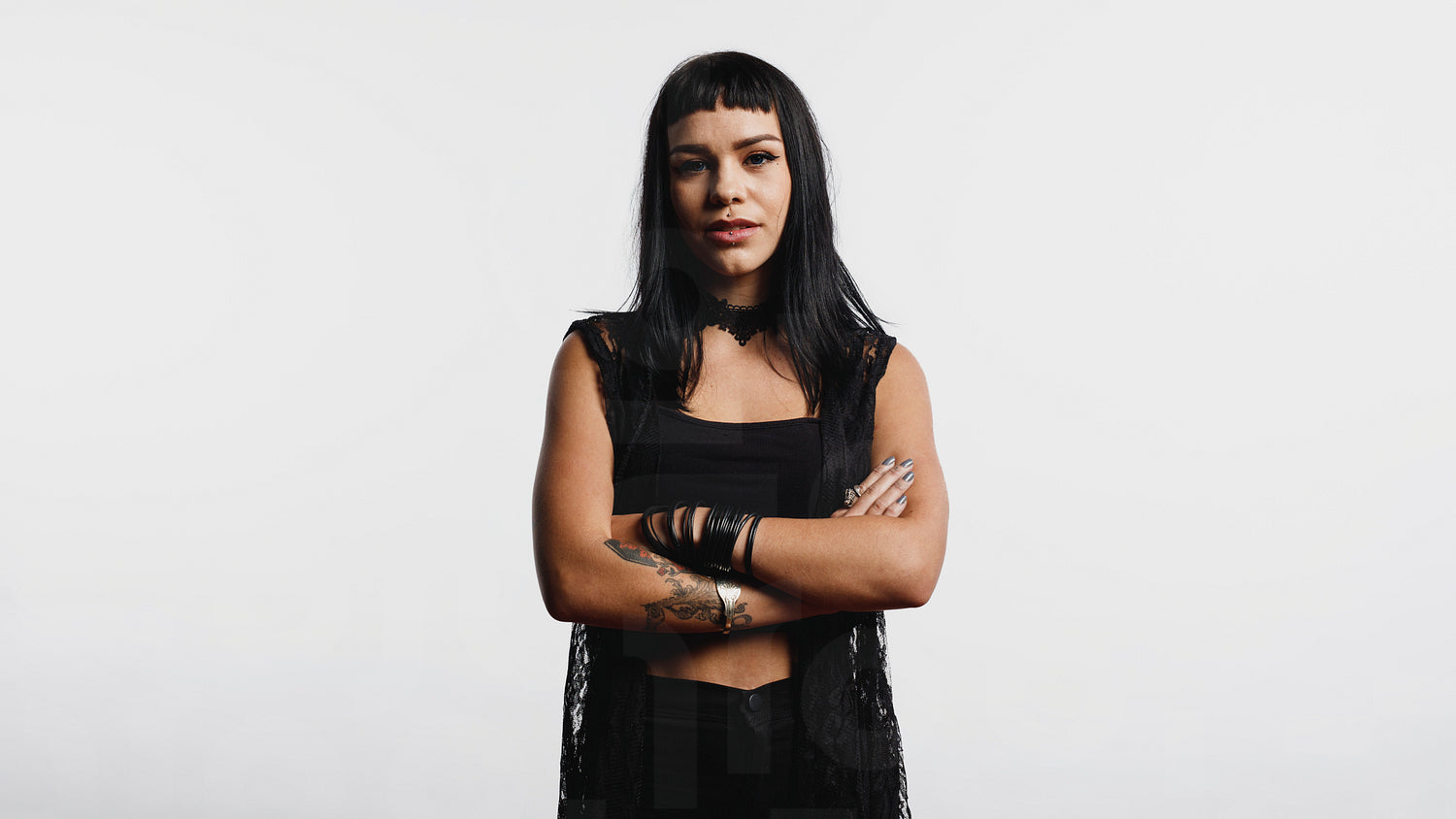 Gothic woman with fashion piercing on lips isolated on white background. Portrait of young woman looking at camera with her arms crossed.