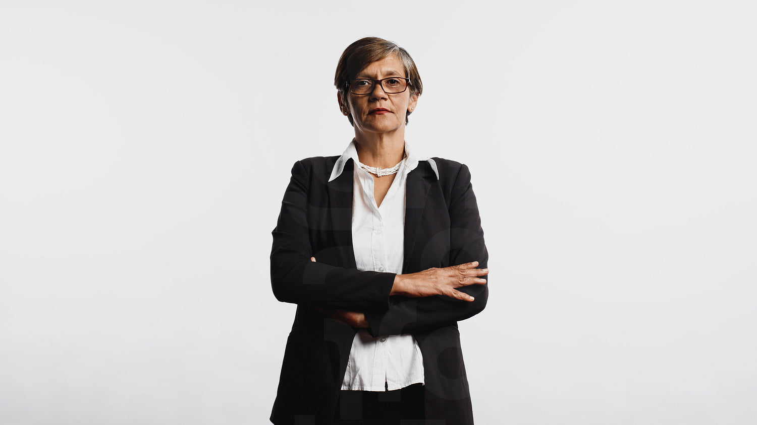 Senior woman standing with arms crossed isolated on white background. Portrait of a confident businesswoman in formal wear looking at camera.