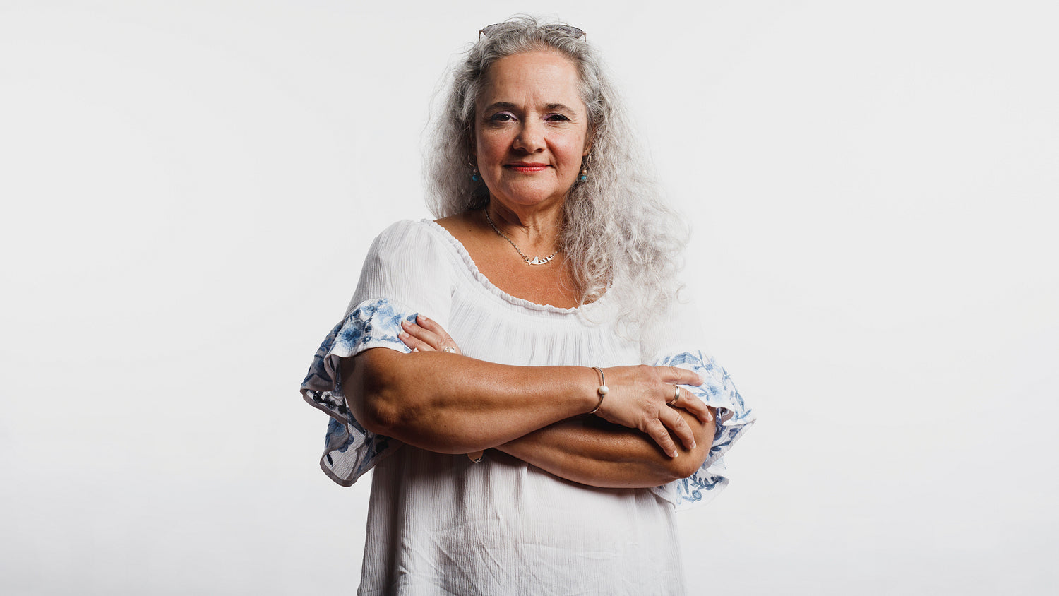 Old woman standing with her arms crossed isolated on white background. Senior woman looking at camera.