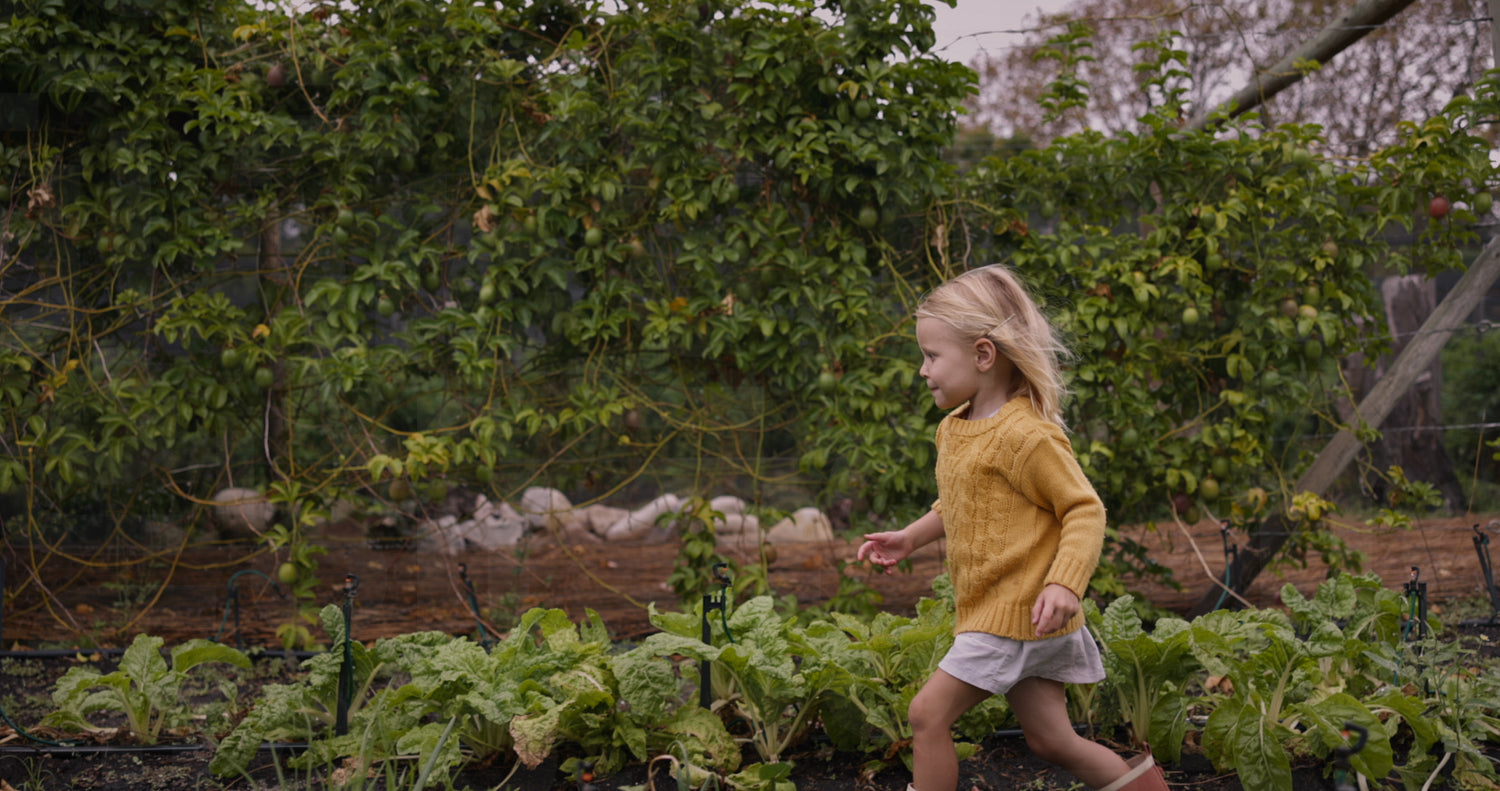 Cute little girl running behind her mother and brother in a vegetable garden. Adorable little girl catching up with her mom and big brother in an agricultural field.