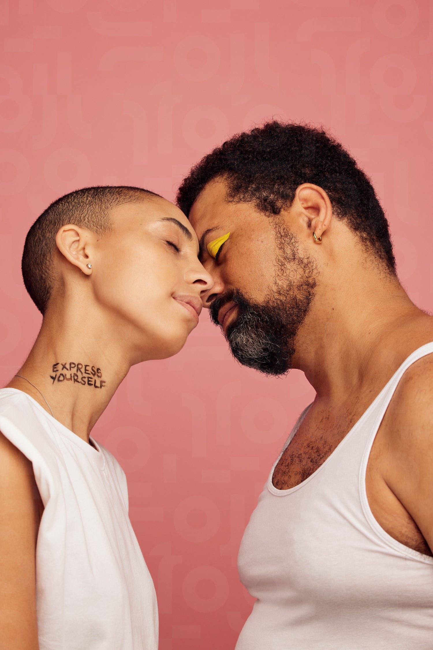 Man wearing makeup and bald woman with express yourself written on her neck.