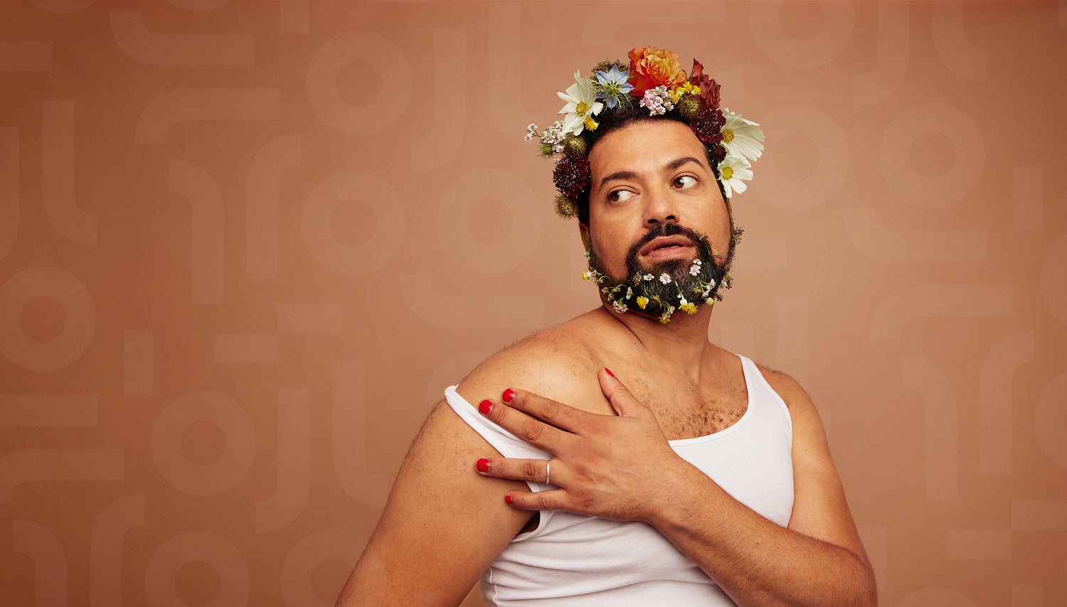 Gender queer wearing tank top and flowers. Non binary person with makeup looking away on brown background.