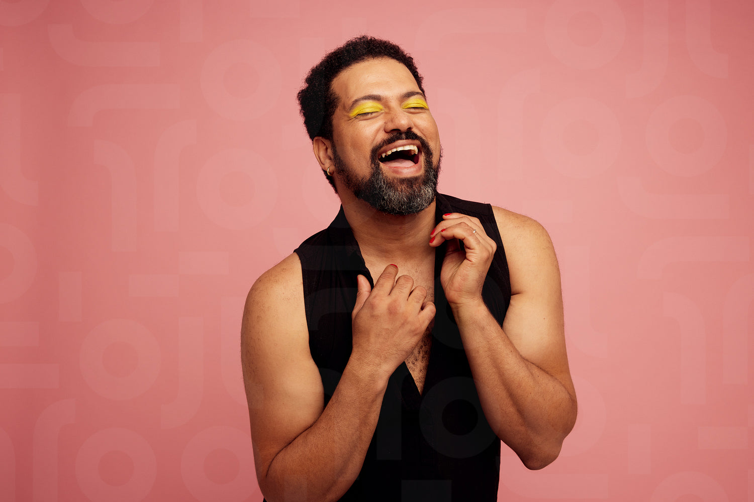 Grad queen with eye makeup smiling on pink background with his eyes closed. Genderqueer in black t-shirt and makeup looking happy.
