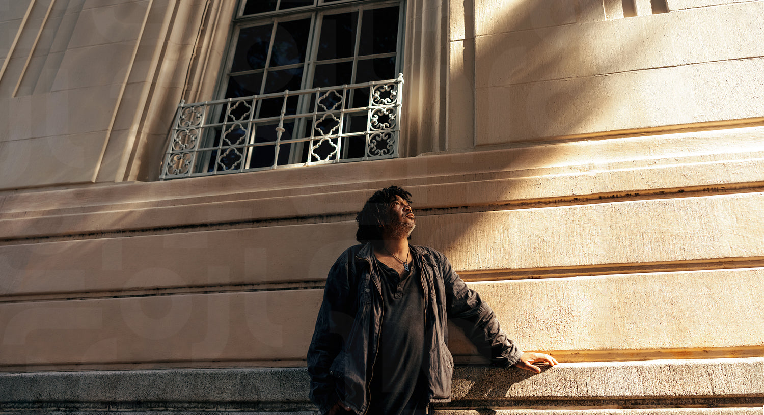Contemplative homeless man looking up while standing alone outdoors during the day. Middle aged underprivileged man having a reflective moment while standing against a brick wall in the city.
