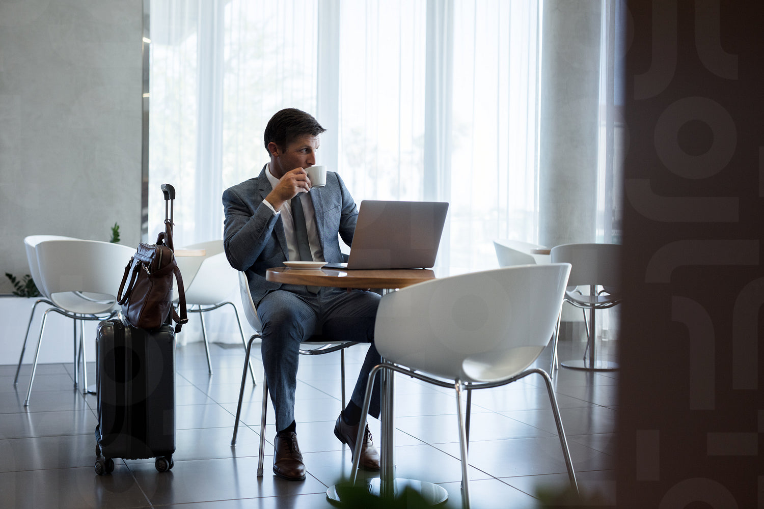 Business man drinking coffee while waiting in a airport lounge. Business executive waiting at lounge.