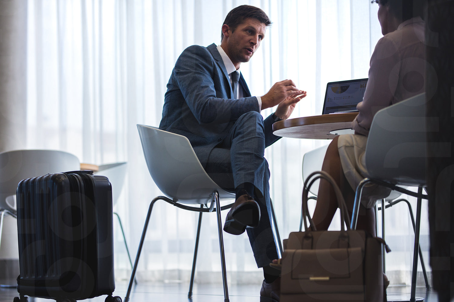 Man and woman sitting at cafe with laptop and talking. Business people waiting for flight at airport cafe.
