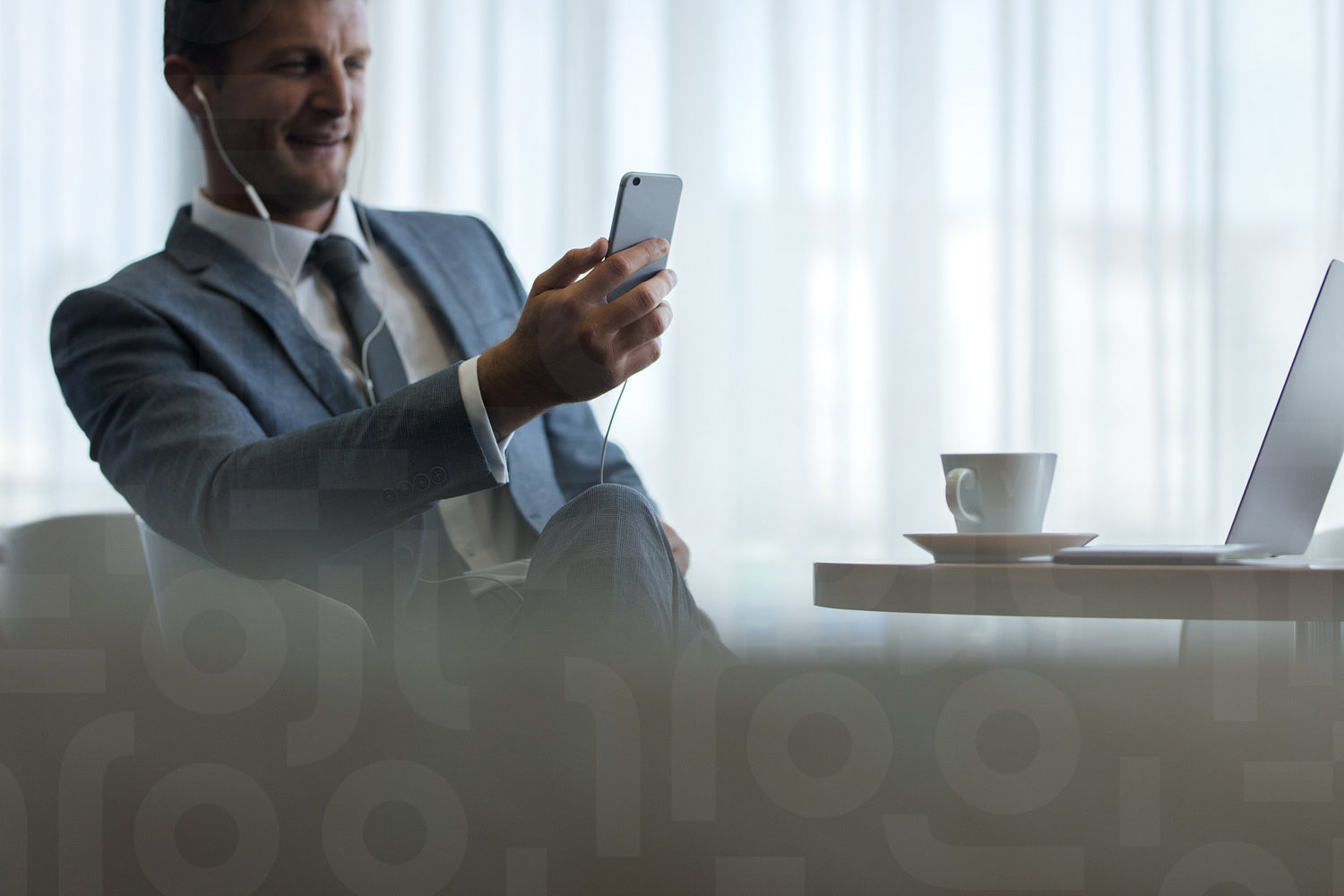Businessman sitting at office lobby and making video call from his smart phone. Male executive relaxing a office hallway using mobile phone.