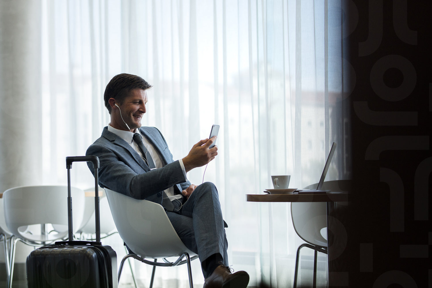 Businessman going on a business trip waiting at airport lounge for his flight and making video call from his mobile phone.