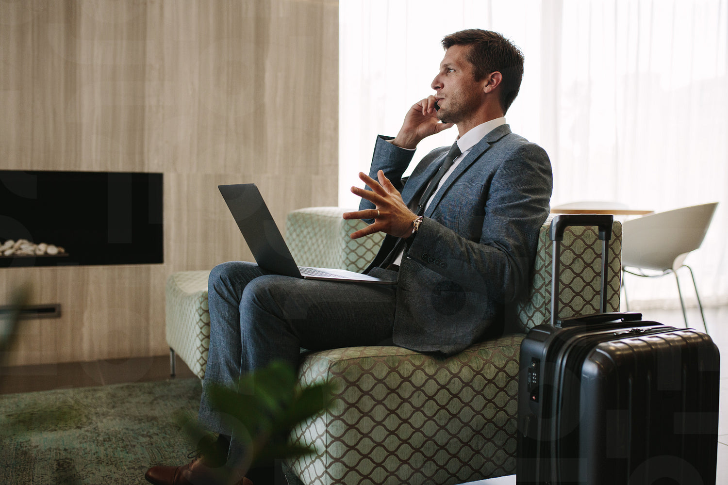 Young businessman with a laptop talking on cellphone in the airport terminal. Caucasian businessman waiting for his flight at airport lounge.