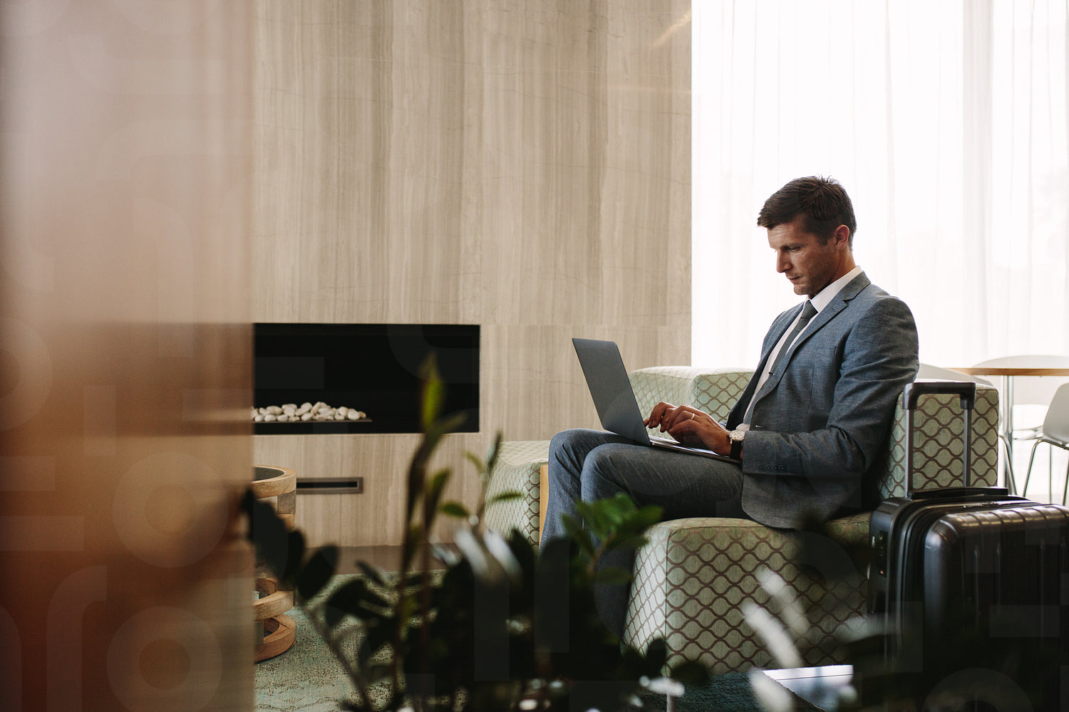 Businessman sitting at airport waiting lounge and working on laptop computer. Male executive in airport business lounge waiting for flight.