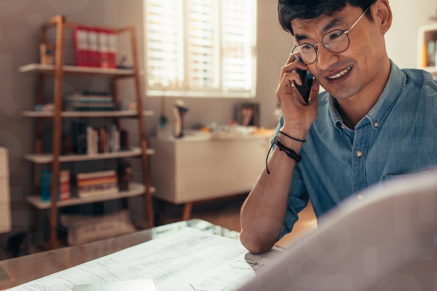 Happy architect looking at drawing and talking over cell phone at his home office. Architect answering phone call at his workplace.