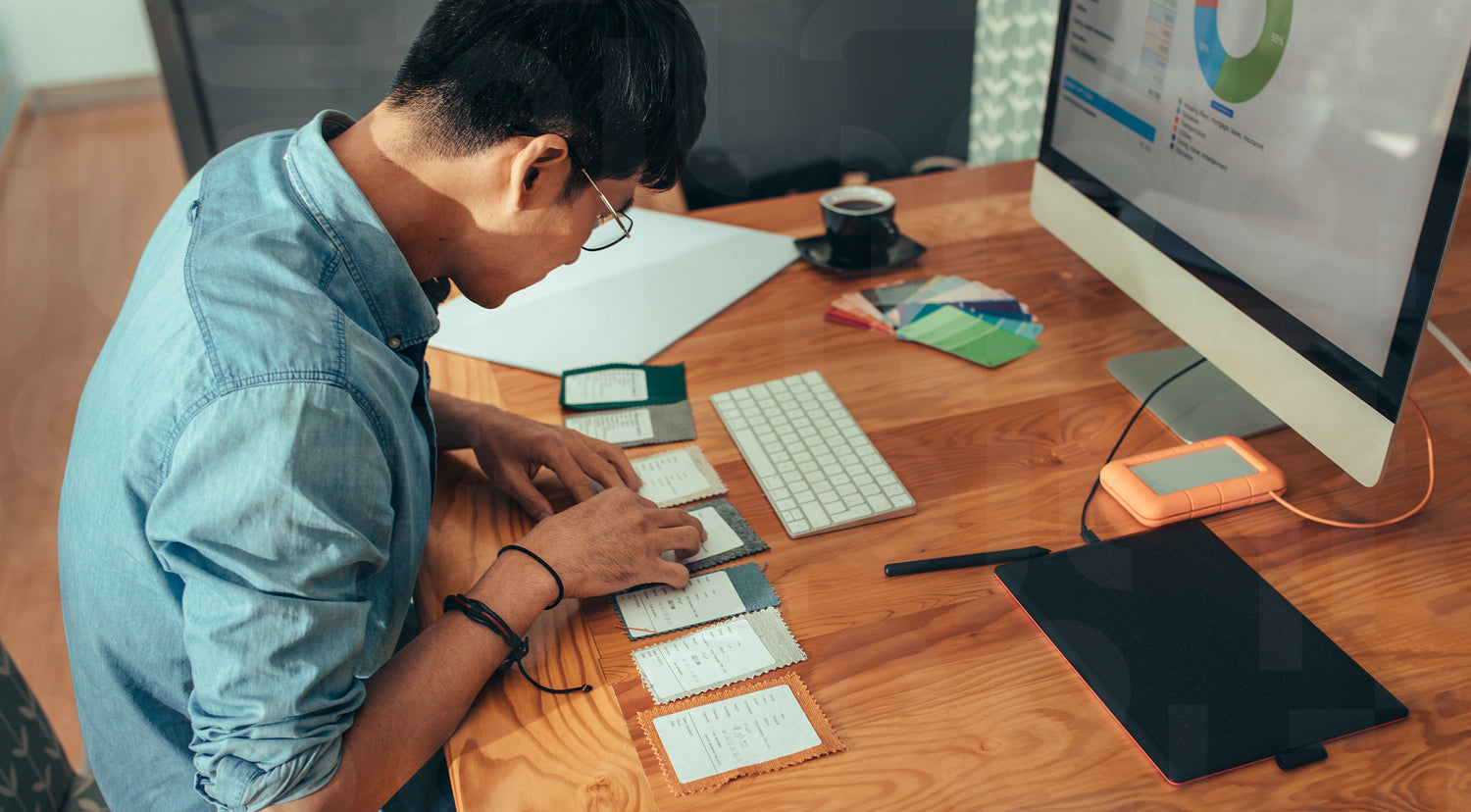 Designer looking at samples of fabrics for curtains and blinds for new project. Interior designer choosing fabrics of interior while working in office.