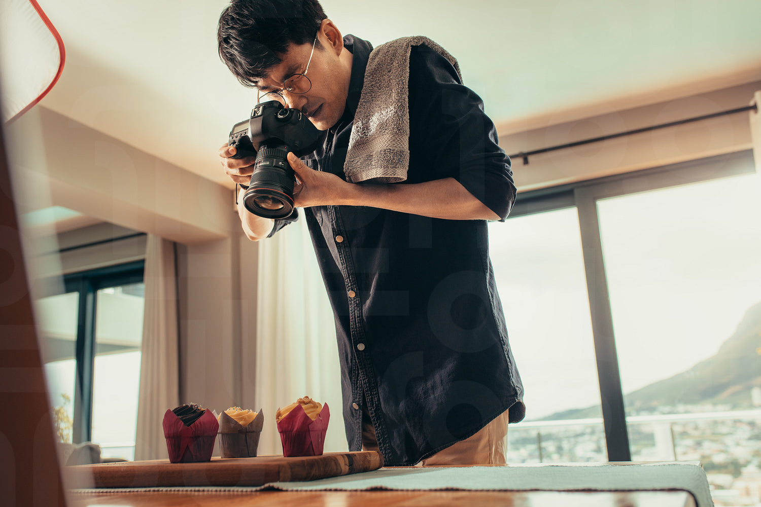 Professional food photographer taking pictures of cup cakes on table with dslr camera. Male photographer taking pictures of sweet food.