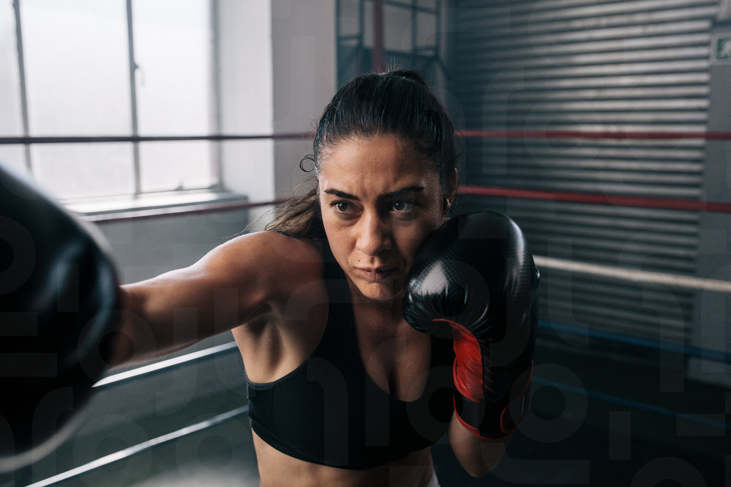 Boxer practicing her punches at a boxing studio. Close up of a female boxer punching with her boxing glove on inside a boxing ring.
