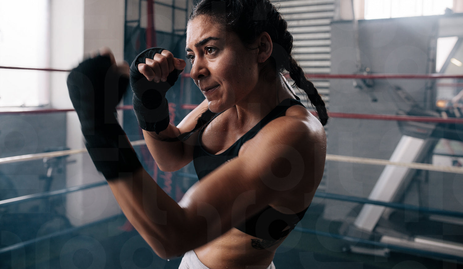 Close up of a female boxer doing shadow boxing inside a boxing ring. Boxer practicing her punches at a boxing studio.