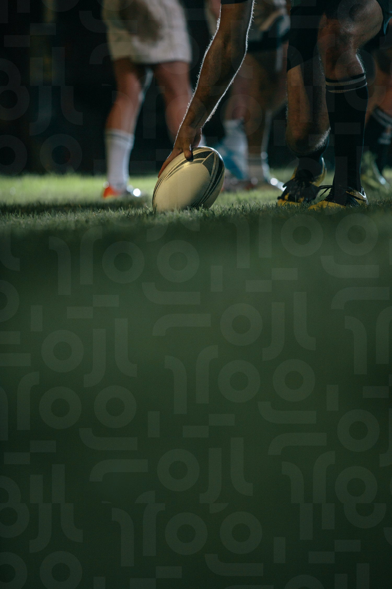Low section of rugby player touching down the ball. Player picking up the oval rugby ball from ground during match.