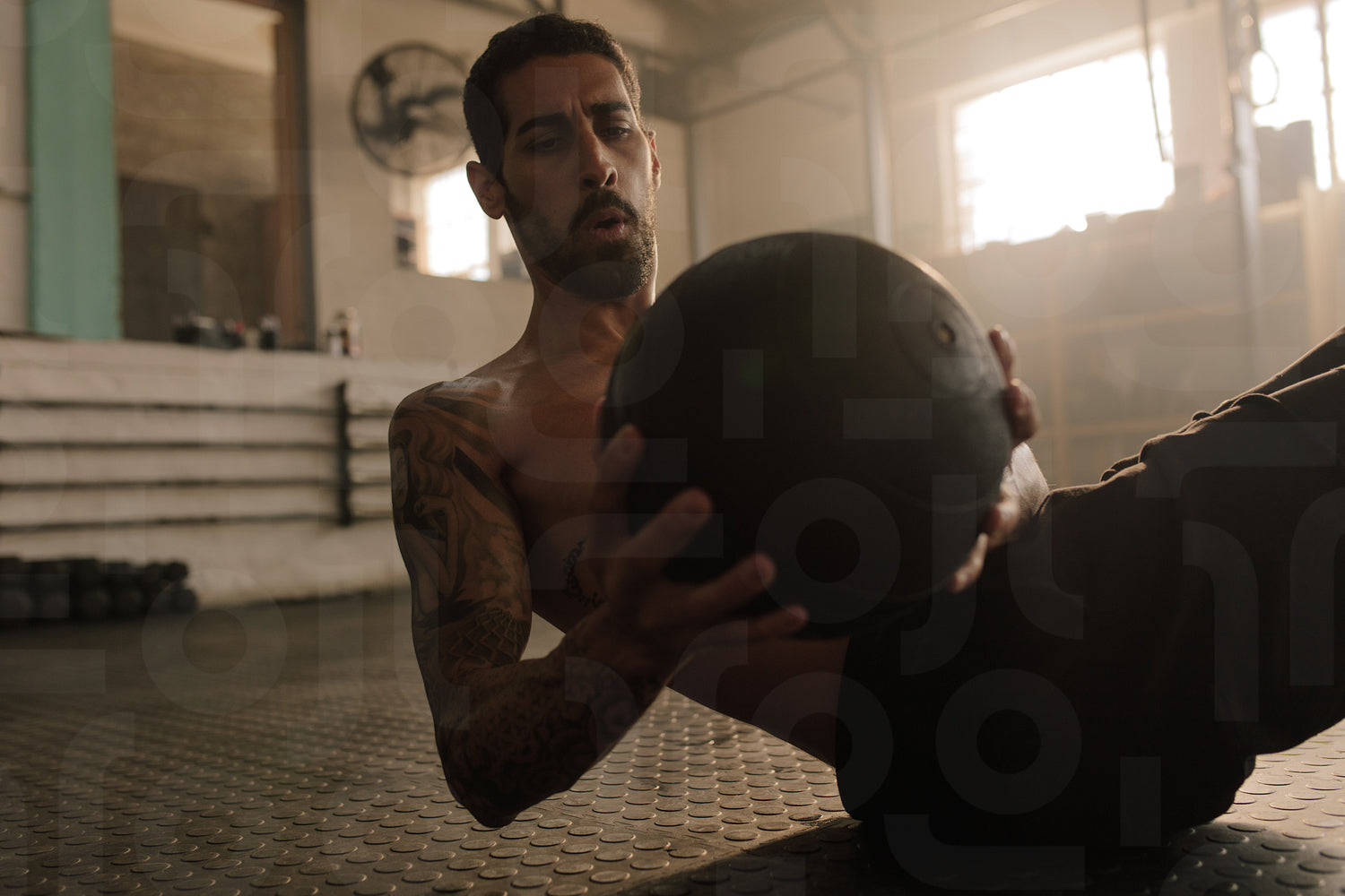 Sportsman working out with fitness ball in gym. Male athlete doing abdominal ball exercise at gym.