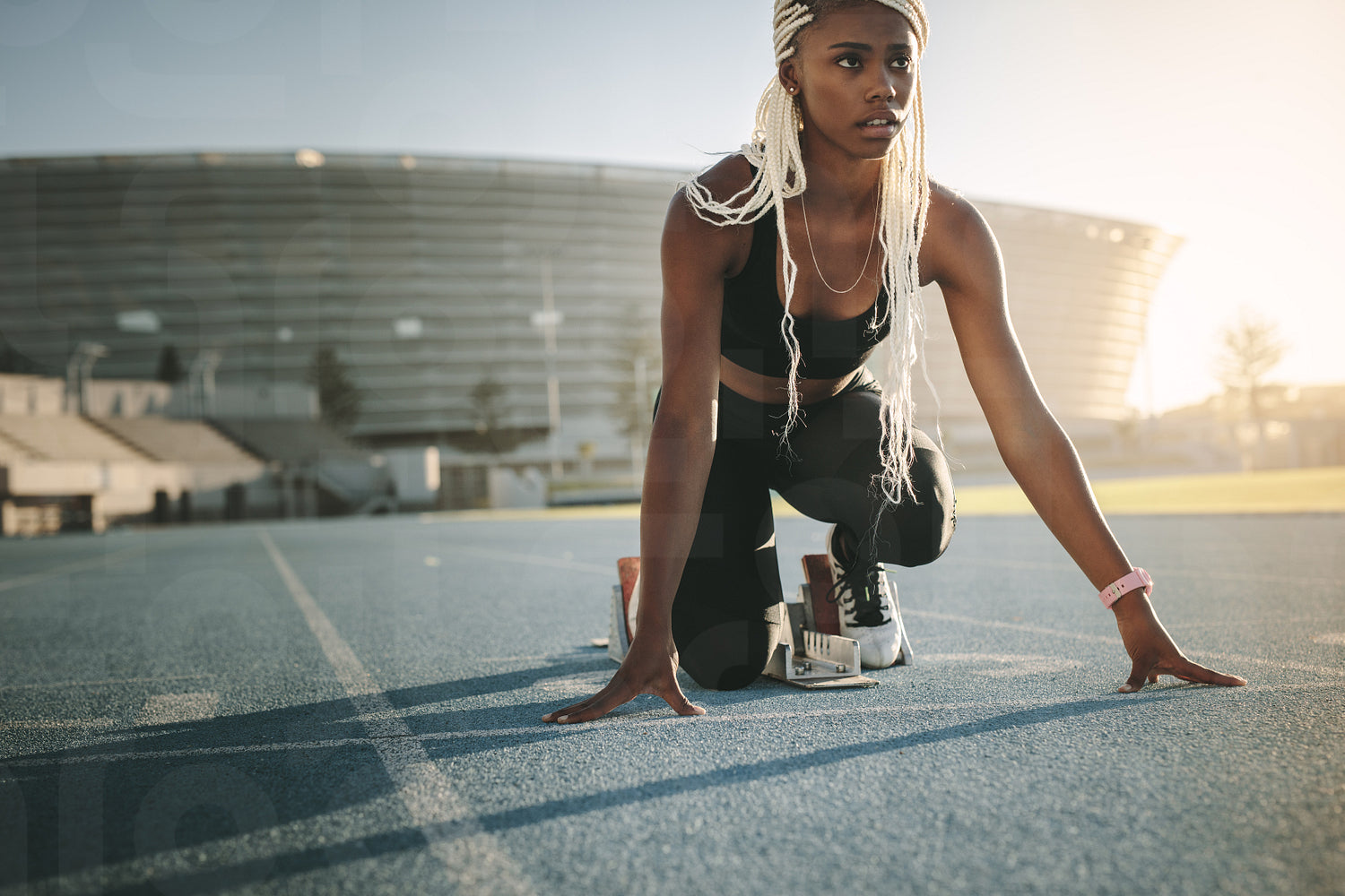 Female athlete taking position on her marks to start off the run. Female runner practicing her sprint on an all-weather running track in a stadium.