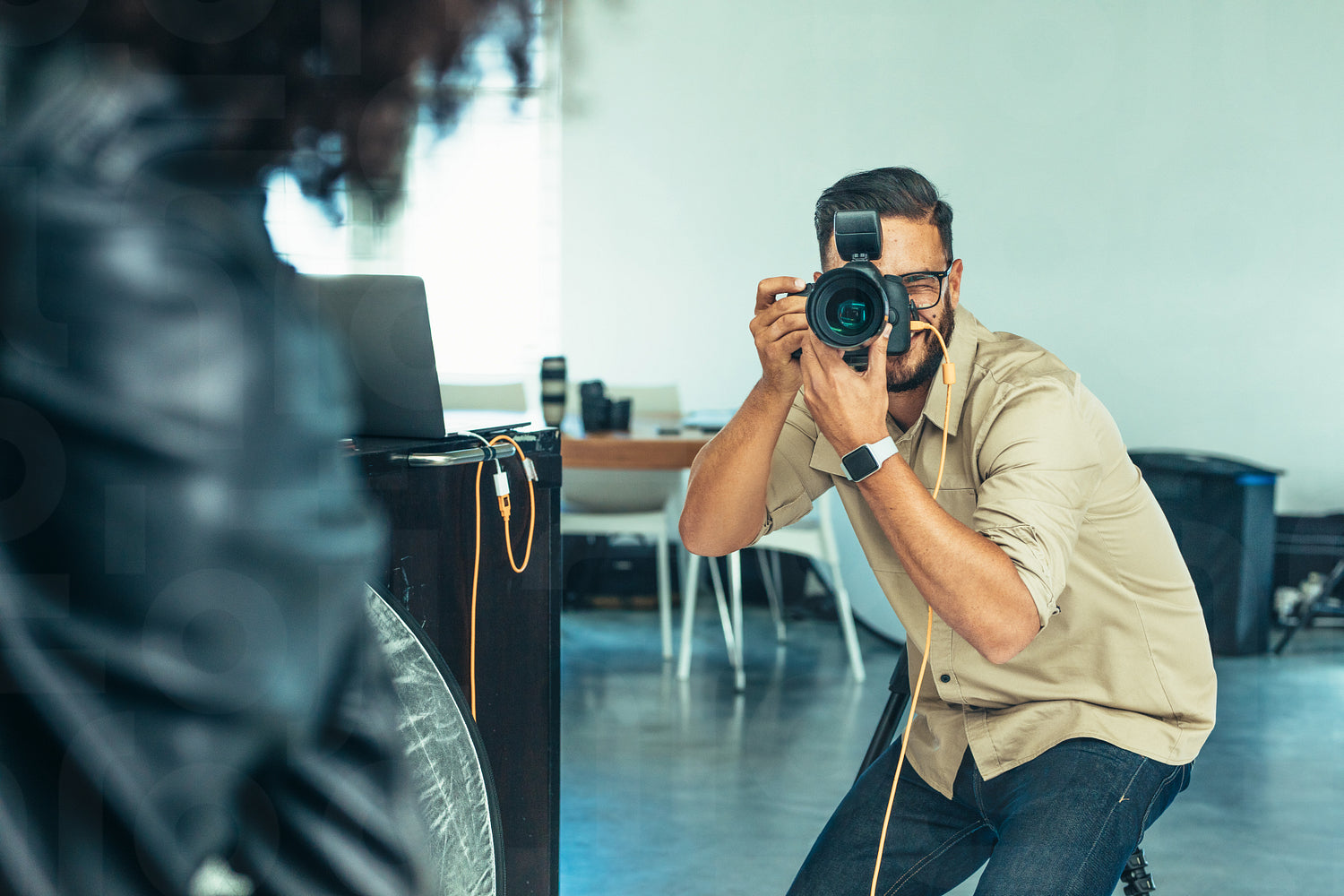 Photographer focusing his DSLR camera on a model during a photo shoot. Photographer taking photos connecting his camera to a laptop.