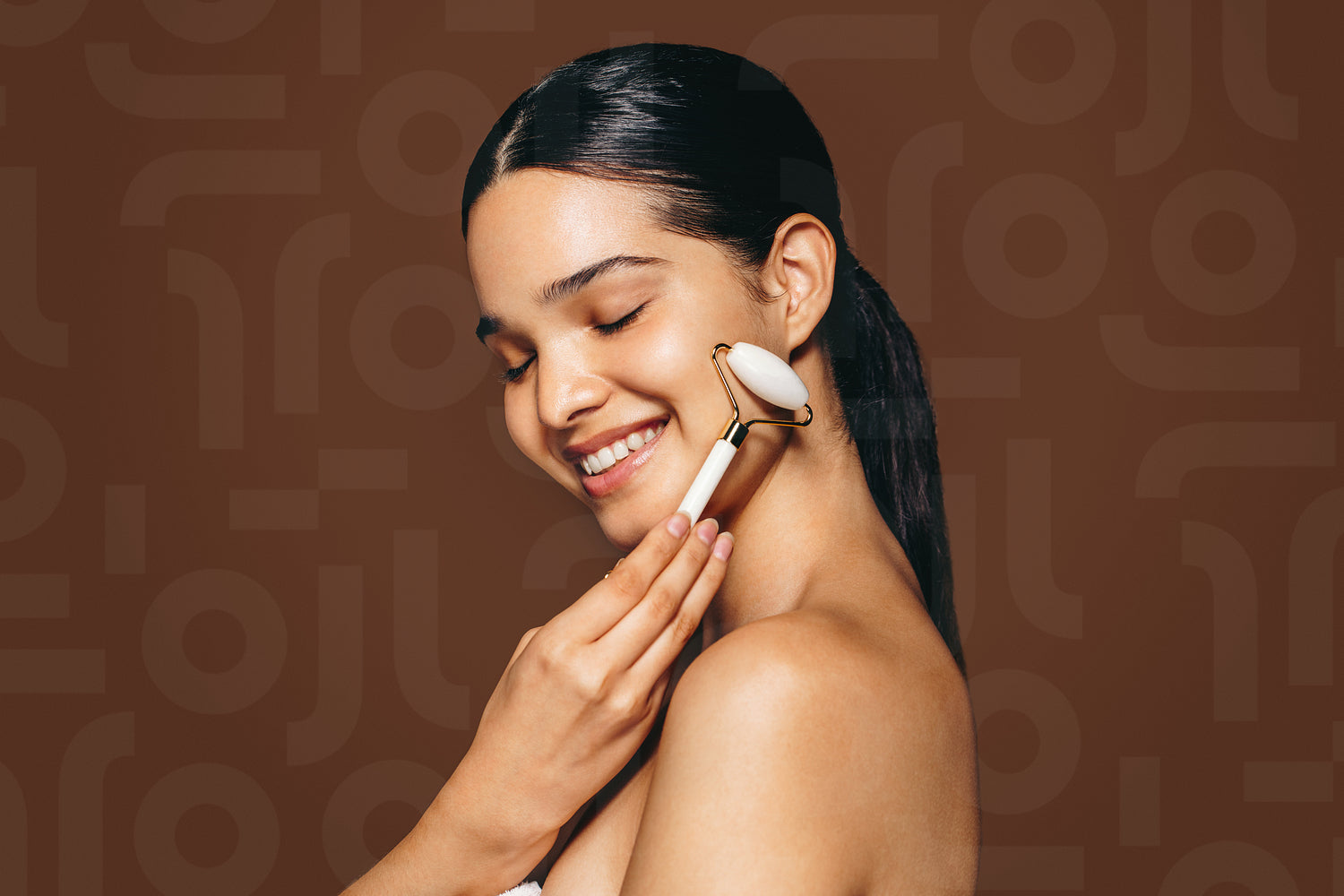 Young woman massaging her skin with a jade stone roller in a studio, she smiles as she uses this beauty tool. This woman is enjoying pampering her skin, and she feels confident in her routine.