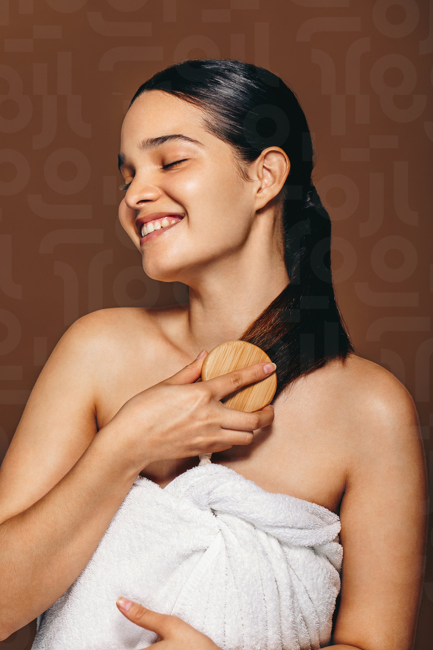 Self-pampering time: Young woman smiles as she brushes her hair after a bath