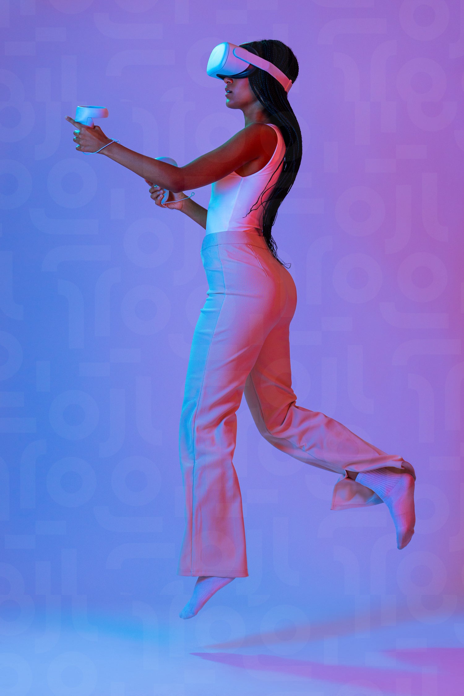 Young woman jumping mid air while playing a virtual reality game in neon light. Modern woman exploring the metaverse with vr goggles and game controllers. Woman having an immersive vr experience.